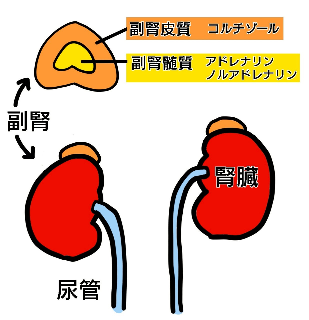 副腎は、左右の腎臓の上に乗っている胡桃ぐらいの大きさの小さい臓器です。